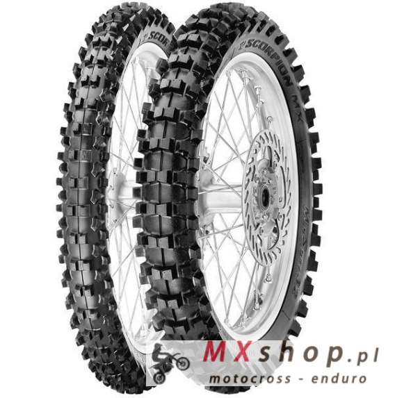 PIRELLI SCORPION MX32 MID SOFT TO GWARANCJA DOSKONAŁEJ WYDAJNOŚCI I KOMFORTU PODCZAS JAZDY PIRELLI SCORPION MX32 MID SOFT to opona motocyklowa wyprodukowana przez włoską markę PIRELLI . Opona cechuje się wyjątkową wszechstronnością i zdolnością do radzenia sobie w zróżnicowanych warunkach terenowych. ZALETY PIRELLI SCORPION MX32 MID SOFT : - Doskonała wydajność - opona zaprojektowana przede wszystkim z myślą o motocyklach motocrossowych, model ten oferuje możliwość montażu zarówno na przednim, jak i tylnym kole, co zapewnia maksymalną wydajność na trasie. - Zastosowanie do różnego rodzaju nawierzchni - jednym z głównych atutów PIRELLI SCORPION MX32 MID SOFT jest doskonała adaptacja do różnych rodzajów miękkich nawierzchni, od ziemistych po piaszczyste podłoża. To sprawia, że jest idealna zarówno do treningów, amatorskich wyścigów, jak i rekreacyjnych przejażdżek w terenie. - Doskonała stabilność oraz trakcja -istotną różnicą między wersją przednią a tylną jest układ bieżnika, składający się z licznych czworokątnych bloków. Taka konstrukcja znacząco wpływa na stabilność kierunkową na trasie. Środkowa część bieżnika w oponie tylnej składa się z dwóch rzędów klocków rozmieszczonych równomiernie, co gwarantuje doskonałą trakcję w kierunku wzdłużnym. - Zwiększony komfort jazdy - opona PIRELLI SCORPION MX32 MID SOFT posiada dwuwarstwowy bieżnik. Dolna warstwa wykonana jest z wytrzymałej mieszanki gumowej, która zapewnia ochronę przed dynamicznymi uderzeniami i wysoką temperaturą. Natomiast górna warstwa charakteryzuje się większą elastycznością, co umożliwia wygładzanie nierówności terenu i podnosi komfort jazdy. PIRELLI SCORPION MX32 MID SOFT to opona motocyklowa , która doskonale radzi sobie na różnych rodzajach nawierzchni i jest odpowiednia zarówno do profesjonalnych zawodów, jak i przyjemnych przejażdżek w terenie. Jeśli poszukujesz opony charakteryzującej się wszechstronnością i wysoką wydajnością, zdecydowanie warto rozważyć ten model.