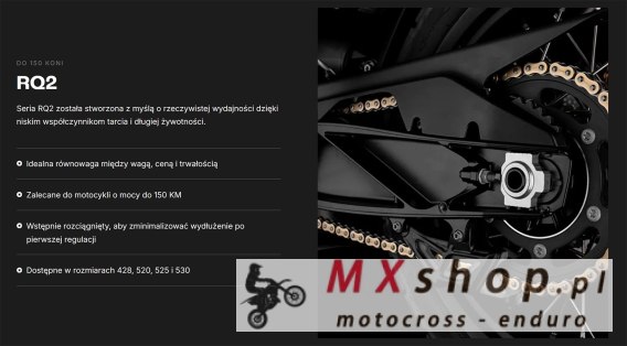 Do 150 KM RQ2 Seria RQ2 została stworzona z myślą o wysokiej wydajności w rzeczywistych warunkach, charakteryzuje się niskim współczynnikiem tarcia i długą żywotnością. Idealna równowaga między masą, kosztem i trwałością Zalecane do motocykli o mocy do 150 KM Wstępnie rozciągnięte, aby zminimalizować wydłużenie po pierwszej regulacji Dostępne w rozmiarach 428, 520, 525 i 530 Opis ogólny przeznaczony do motocykli drogowych seria RQ2 zaprojektowana do realnych warunków użytkowania i długiej eksploatacji doskonała równowaga pomiędzy wagą kosztami i trwałością rekomendowany do motocykli o mocy do 150 KM uszczelnienie X-Ring ograniczające tarcie i wydłużające żywotność łańcucha płynna i cicha praca napędu oraz stabilne przeniesienie mocy wstępnie rozciągnięty w celu ograniczenia wydłużenia po pierwszej regulacji naciągu w zestawie zakuwka z nitem drążonym ułatwiająca montaż standardowymi narzędziami rozmiar 520 jako uniwersalny standard do wielu motocykli drogowych